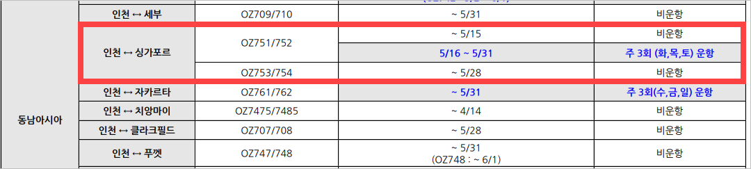 4월 9일 기준으로 아시아나 항공에서는 4월 말까지 싱가포르-한국 노선은 비운항이 확정이며, 5월 일정에 대해서는 감편운항을 하는 것으로 결정이 되어, 기존 예약자들을 대상으로 일정 변경 안내를 해주고 있다는 연락을 받았습니다.