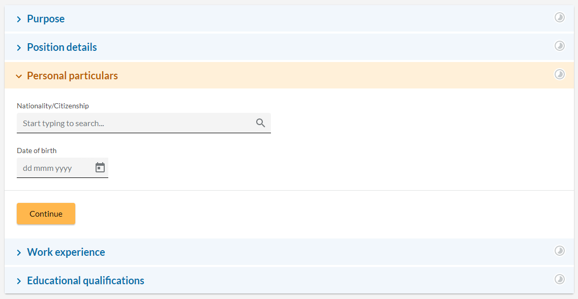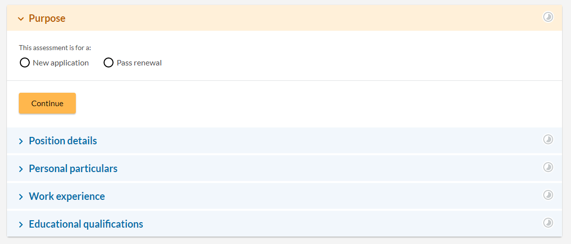 2. 신규 취업이면 New application, 취업비자 갱신이면 Pass renewal 클릭 후에 Continue