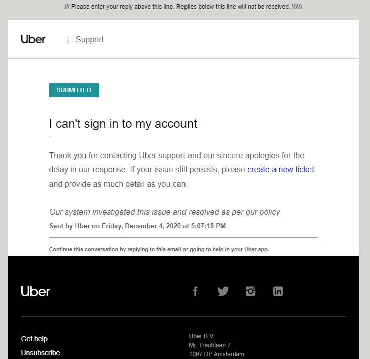물론 Uber가 당장 수시간 내로 답변을 준다는 기대는 하지 않았고, 다음 날이라도 Uber를 이용하려는 생각에 헬프데스크로 티켓을 접수했는데.......