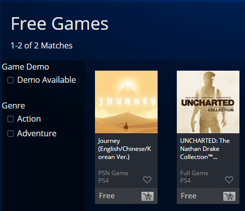소니 플레이스토어에서 상단의 PLAY AT HOME 메뉴를 통하여 각 나라별로 2가지 게임이 무료로 제공되고 있습니다. PSN PLUS 가입 여부 상관없이 PSN 계정만 있으면 무료로 구매가 가능합니다.