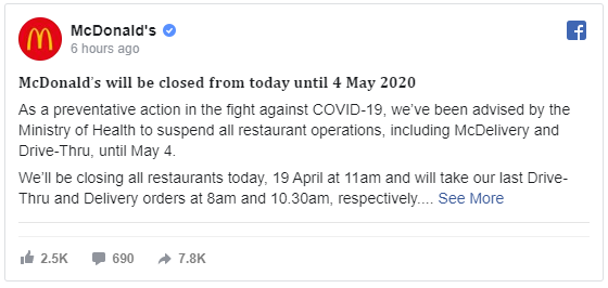 4월 19일 일요일 오전에 발표된 맥도날드에서 발표된 내용에 의하면 오늘 마지막 드라이브 스루 및 딜리버리 주문을 8am와 10:30 am 실시하는 것을 마지막으로 모든 싱가포르 내의 130개 매장은 영업을 5월 4일까지 일시 중단한다고 발표하였습니다. 관련기사는 아래의 링크에서 좀 더 자세한 내용을 기사를 통하여 확인할 수 있습니다.