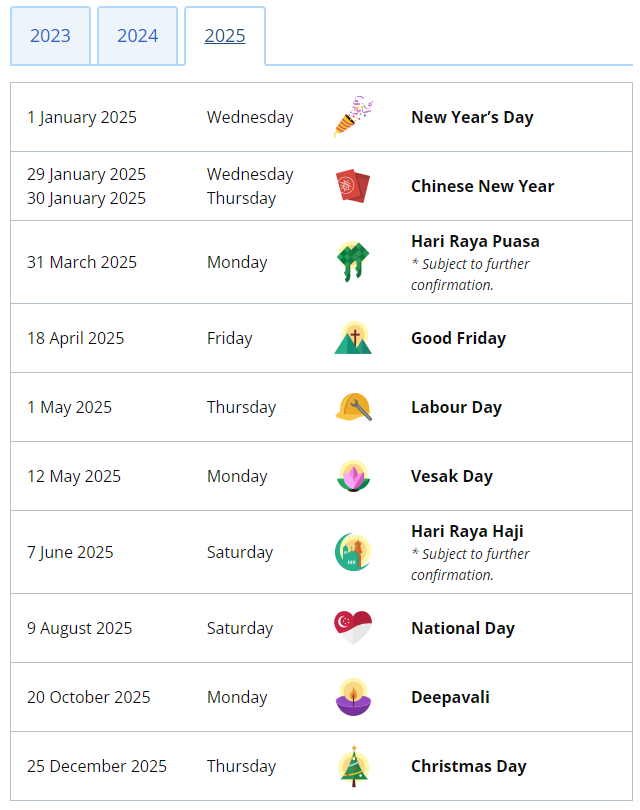 2025년 싱가포르의 공휴일(Public Holiday)가 싱가포르 노동부인 MOM(Ministry of Manpower)를 통하여 확정 공지가 되었습니다. 이미 2025년의 휴가 계획을 세우고, 여행 일정을 준비하는 많은 싱가포리안들이 있을 것으로 예상을 하고 있습니다.
