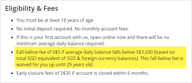 아래의 싱가포르의 한 은행이 게시한 계좌 오픈 자격 및 수수료에 나와 있듯이, 계좌 일평 군 예치금이 싱달러로 $3,000(원화 250만 원) 이하 일 경우에 보통 적게는 $2에서 많게는 $5까지 매달 수수료를 해당 계좌에서 자동으로 차감합니다.