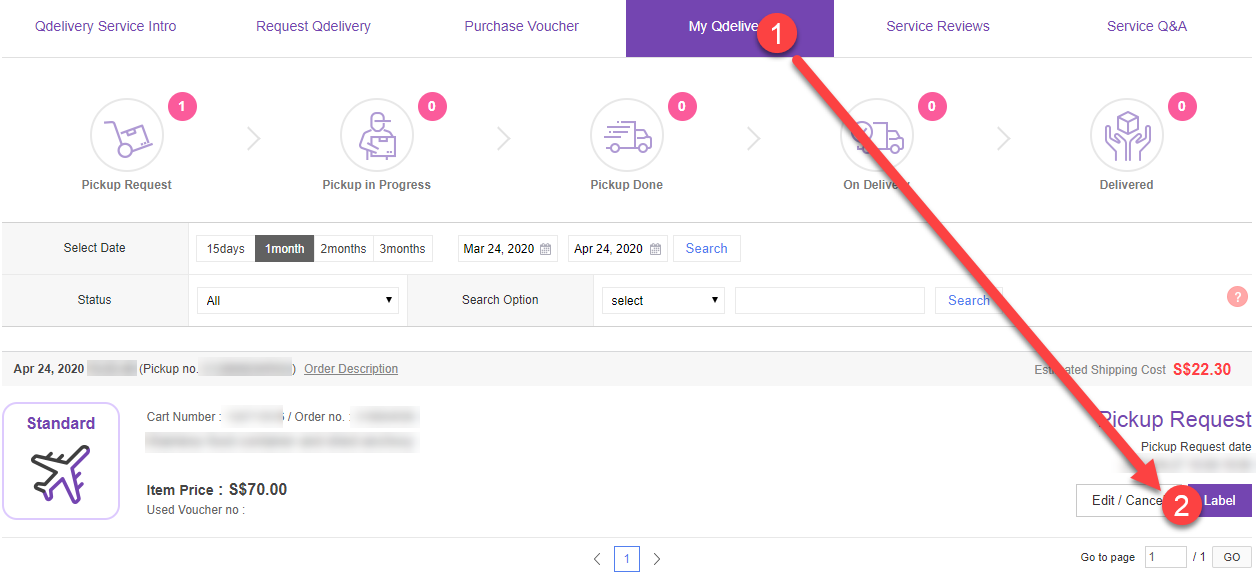10. 결재 후에 1)My Qdelivery 메뉴로 이동하여, 2) Label 클릭