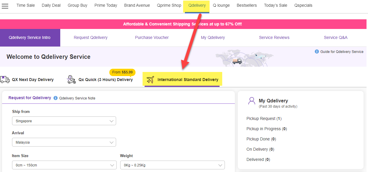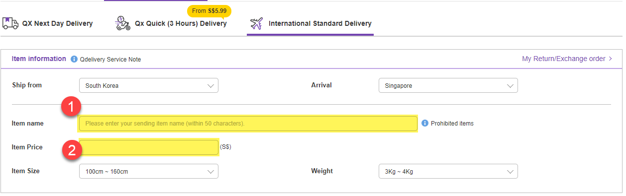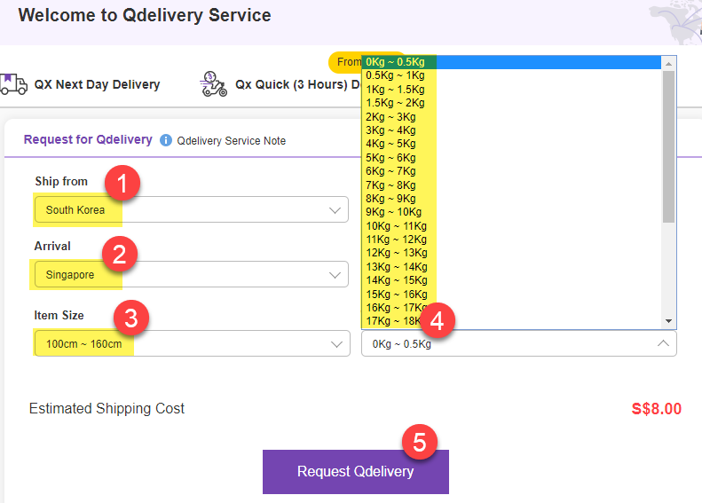4. 아래의 순서대로 1) 보내는 나라, 2) 받는 나라, 3) 아이템 사이즈, 4) 무게 선택 후에 5) Reuest Qdelivery 클릭