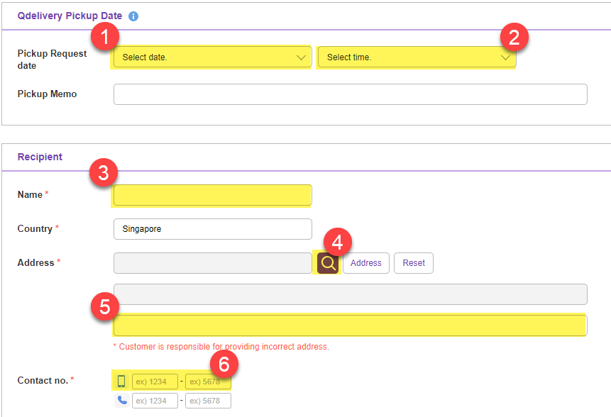7. Qdelivery Pickup Date에서 1)택배 픽업 날짜, 2) 픽업 시간 선택, 받는 사람 정보에서 3) 받는 사람 이름, 4) 받는 주소(돋보기로 우편번호 검색), 5) 세부 주소 입력, 6) 받는 사람 핸드폰 번호 입력