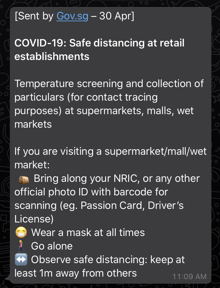 오늘 4월 30일 싱가포르 코비드19 관련 메세징 서비스인 왓츠앱 gov.sg으로 부터 수신된 내용에 의하면 체온 검사와 컨택트레이싱을 위한 방문객 정보 취득을 모든 마켓에서 의무적으로 실시한다고 합니다.