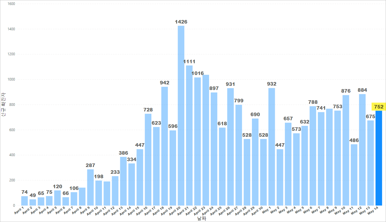 - 일일 완치 기록 중 가장 많은 완치 인원 1,164명을 5월 14일에 확인.