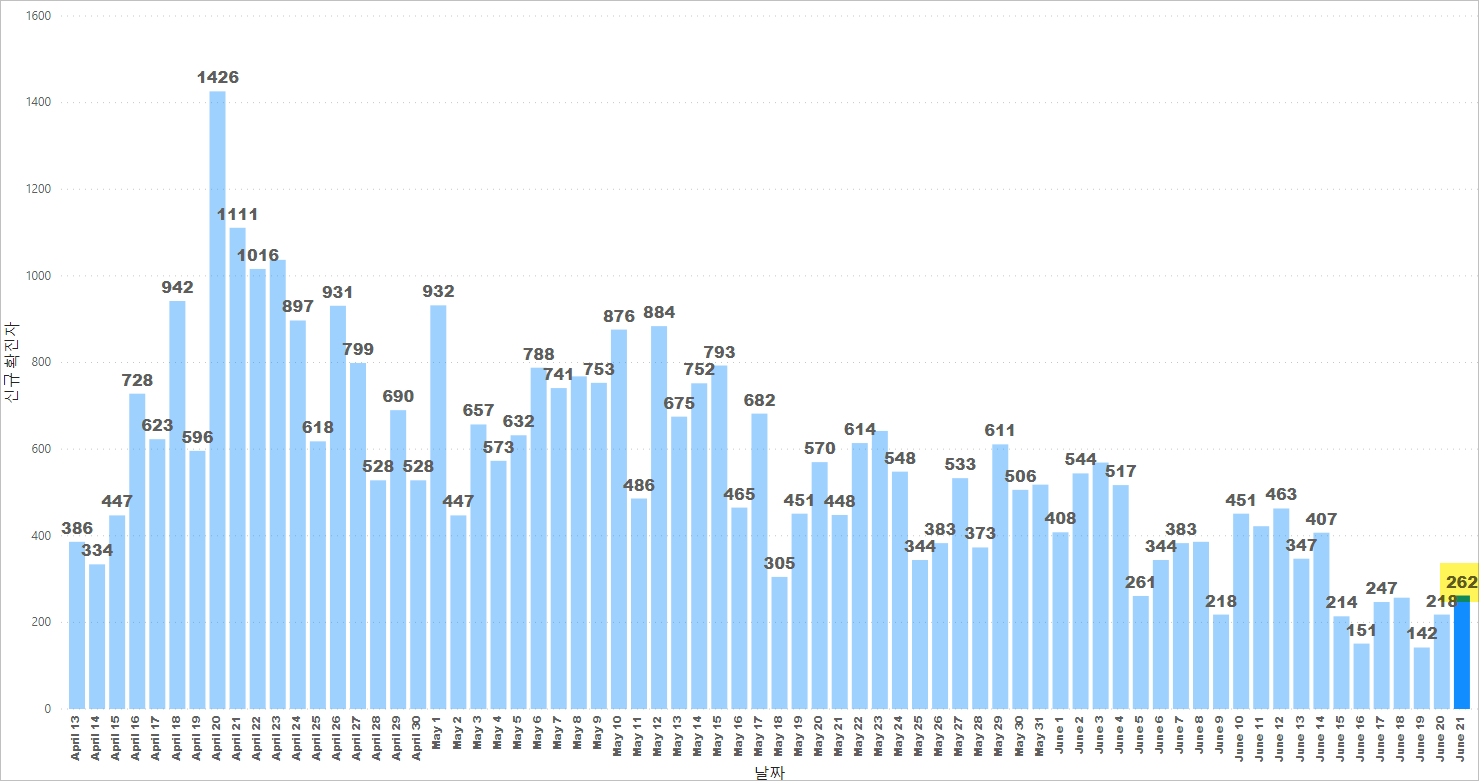 싱가포르 코비드19 신규 확진 262명, 전체 42,095명, 6월 21일 일요일