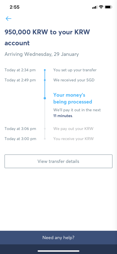 아래의 화면에서 보듯이 송금 시작해서 한국 계좌로 송금을 받기까지 총 필요한 시간이 30분 내외인 것을 확인할 수 있다.