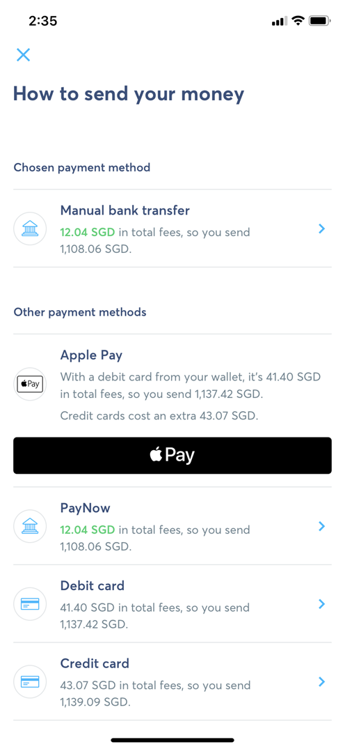 여러 가지 방법이 있으나, 아래의 화면에서 보듯이 Manual bank transfer와 PayNow 송금이 수수료가 가장 저렴한 것을 확인할 수가 있다.