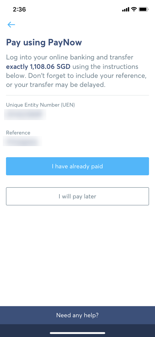 - 인터넷 뱅킹이나 뱅킹 앱을 이용하여 PayNow로 송금을 별도로 진행한다