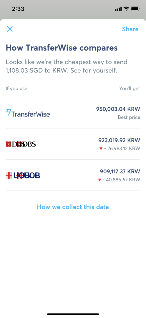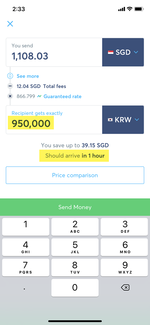 5. 혹시 송금 수수료가 기존 싱가포르 은행과 비교하여 얼마나 저렴한지 확인해보려면 이전 화면 아래에 위치한 Price comparison을 선택하면 아래와 같이 송금하고자 하는 금액의 은행 송금 수수료도 바로 확인이 가능하다.