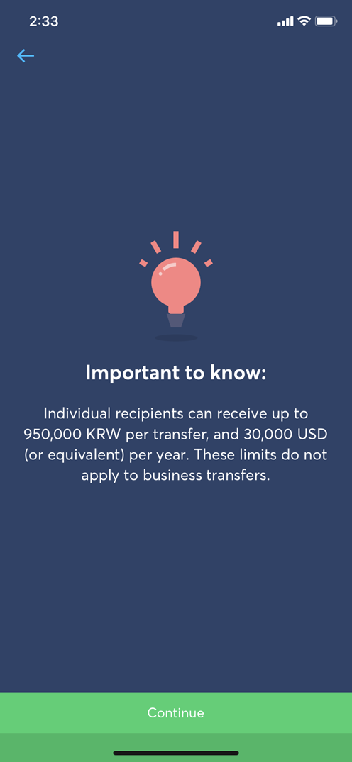 6. 송금과 관련된 세부 정보를 입력하기 전에 다시 한번 개인송금은 1회에 95만 원까지 가능하다고 설명이 다시 나온다. Continue를 탭 하여 다음으로 진행.