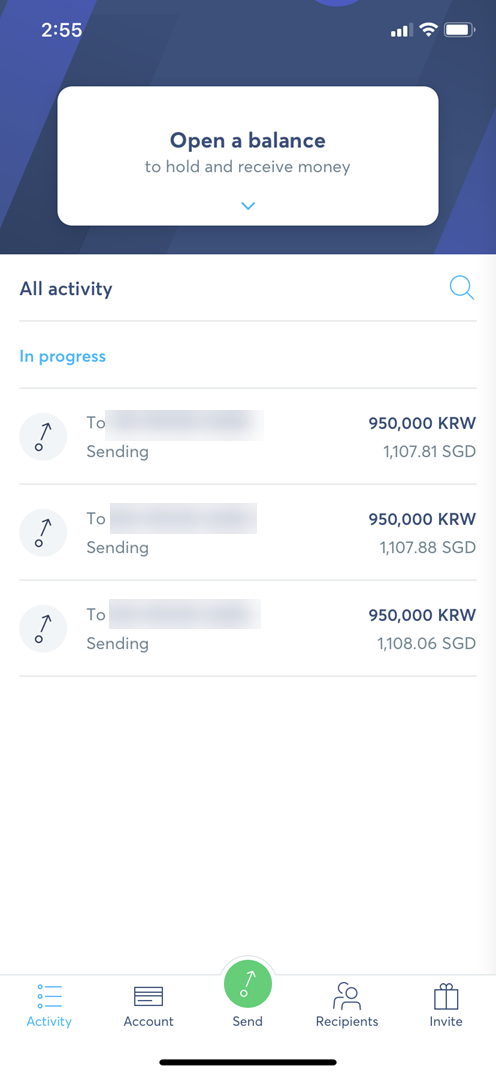 상태가 Sent로 표시가 된다. 아직 진행 중이라면 In progress에서 확인이 가능하고 진행 상황 확인은 해당 송금 라인은 탭 하면 된다.