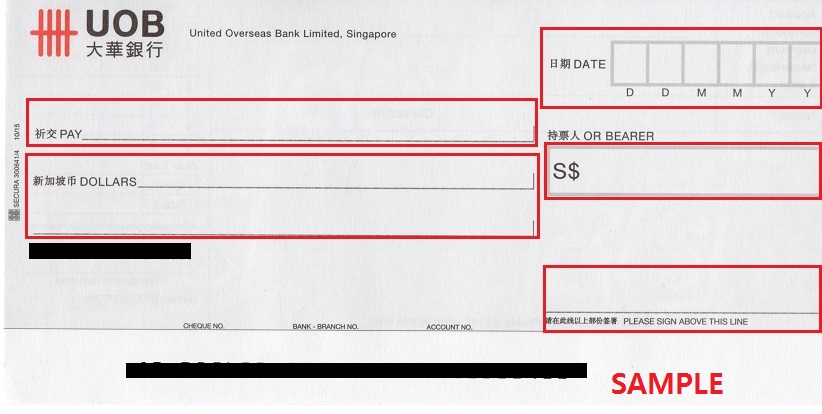 - S$: 지불하는 금액을 숫자로 기입합니다. 금액은 위의 DOLLARS에 기입된 내용과 일치해야 합니다. 예를 들어 DOLLARS에 Five hundread dollars only라고 기입이 되었다면 S$에는 500.00/-라고 기입합니다.