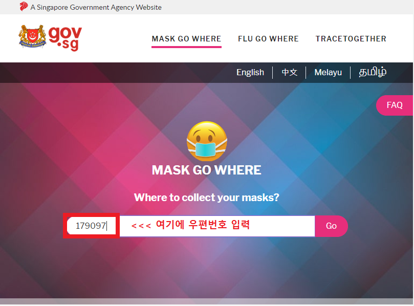 1. Mask Go Where(https://www.maskgowhere.gov.sg/) 페이지로 이동, 본인의 거주 주소지 우편번호를 입력