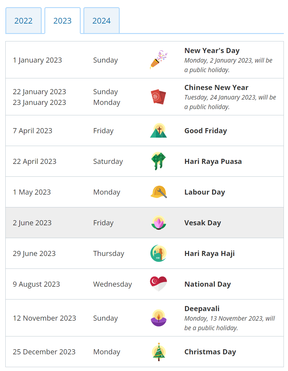 싱가포르 노동부인 MOM에서는 매년 국가 공휴일을 잘 이해 할 수 있도록 홈페이지에서 공식적으로 안내를 하고 있습니다. MOM에서 발표한 2023년의 싱가포르 공휴일은 일요일과 대체공휴일을 모두 포함하니 11일로 아래의 표에서 확인이 됩니다.