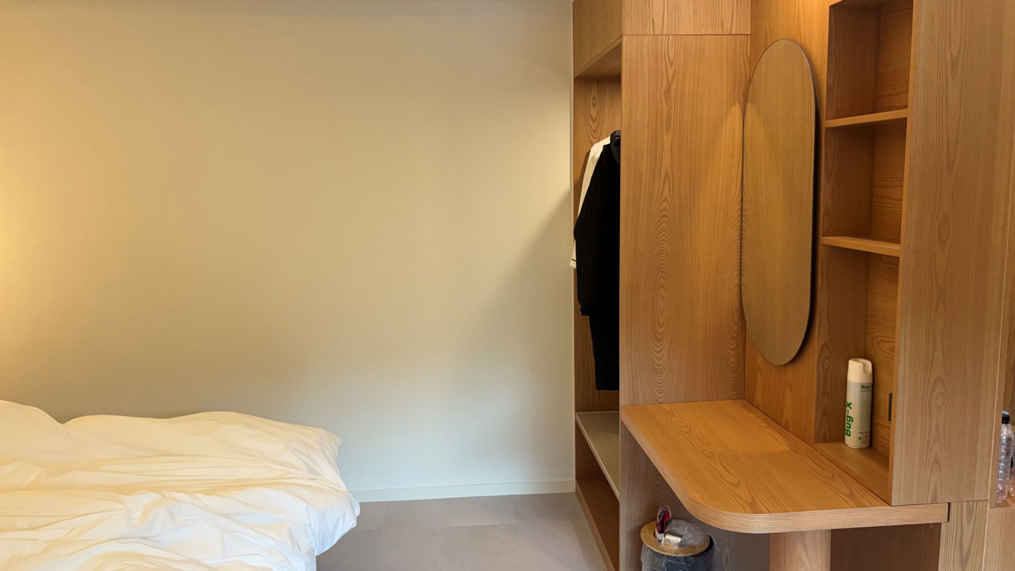 - 거실 공간: 벽걸이 TV와 낮은 좌식 테이블이 있어 도란도란 이야기 나누기 좋습니다.