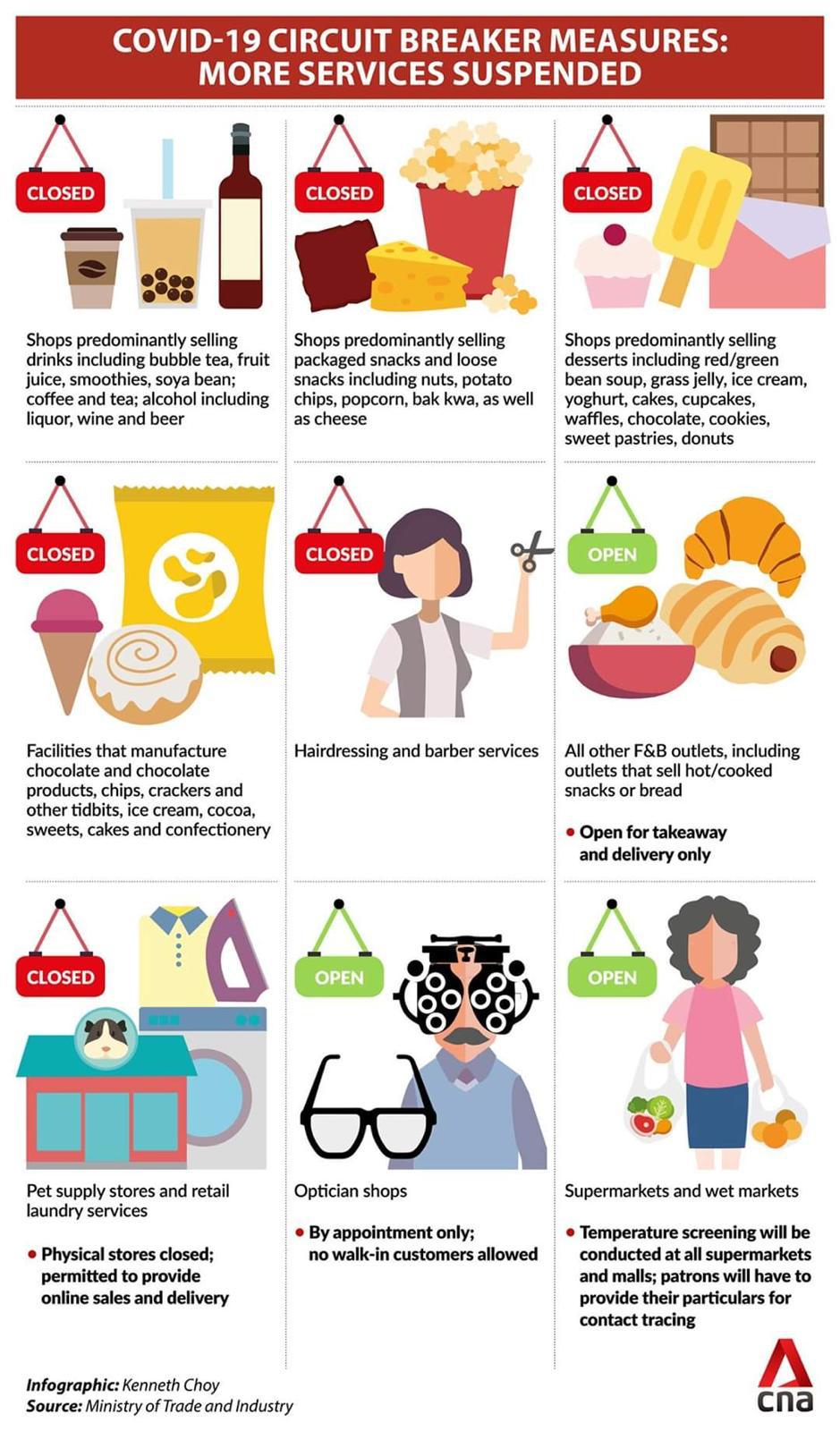 4월 21일 오후 5시 싱가포르 총리 리센룽의 프레스 콘퍼런스에 의하면 싱가포르 서킷브레이커를 기존 5월 4일에서 6월 1일까지로 1개월 연장하기로 결정.