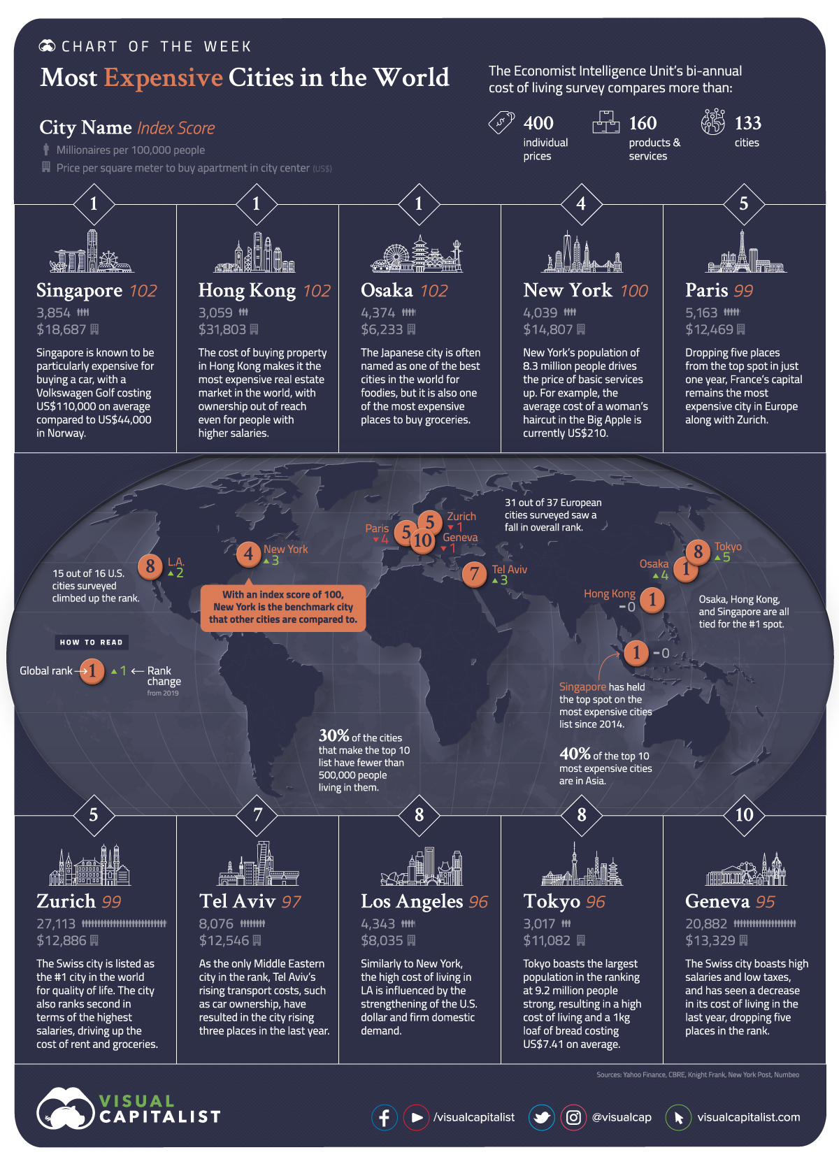 위의 항목을 고려하여 집계된 2020 Worldwide Cost of Living report(https://www.eiu.com/n/campaigns/worldwide-cost-of-living-2020/, EconoEconomist Intelligence Unit)에 의하면 미국 뉴욕을 기준 점인 인덱스 100으로 정하여 133개 도시의 물가를 비교한 결과 싱가포르가 인덱스 스코어 102로 홍콩, 오사카와 더불어 세계에서 물가가 가장 비싼 나라 1위로 랭크가 되었습니다.